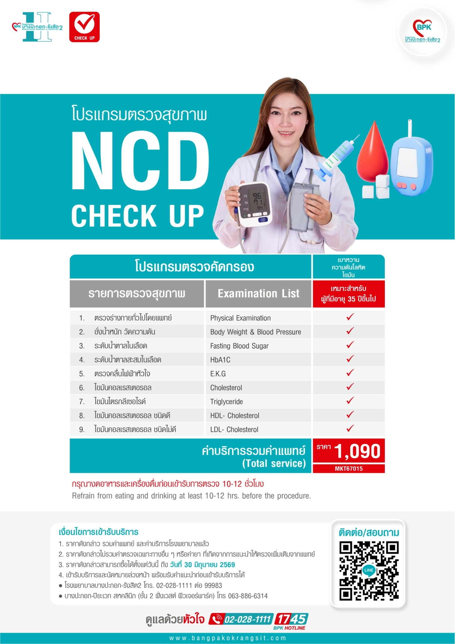 - ราคาพิเศษดังกล่าวไม่รวมค่าตรวจเฉพาะทางอื่นๆ หรือค่ายาที่เกิดขึ้นนอกเหนือจากแพ็กเกจ