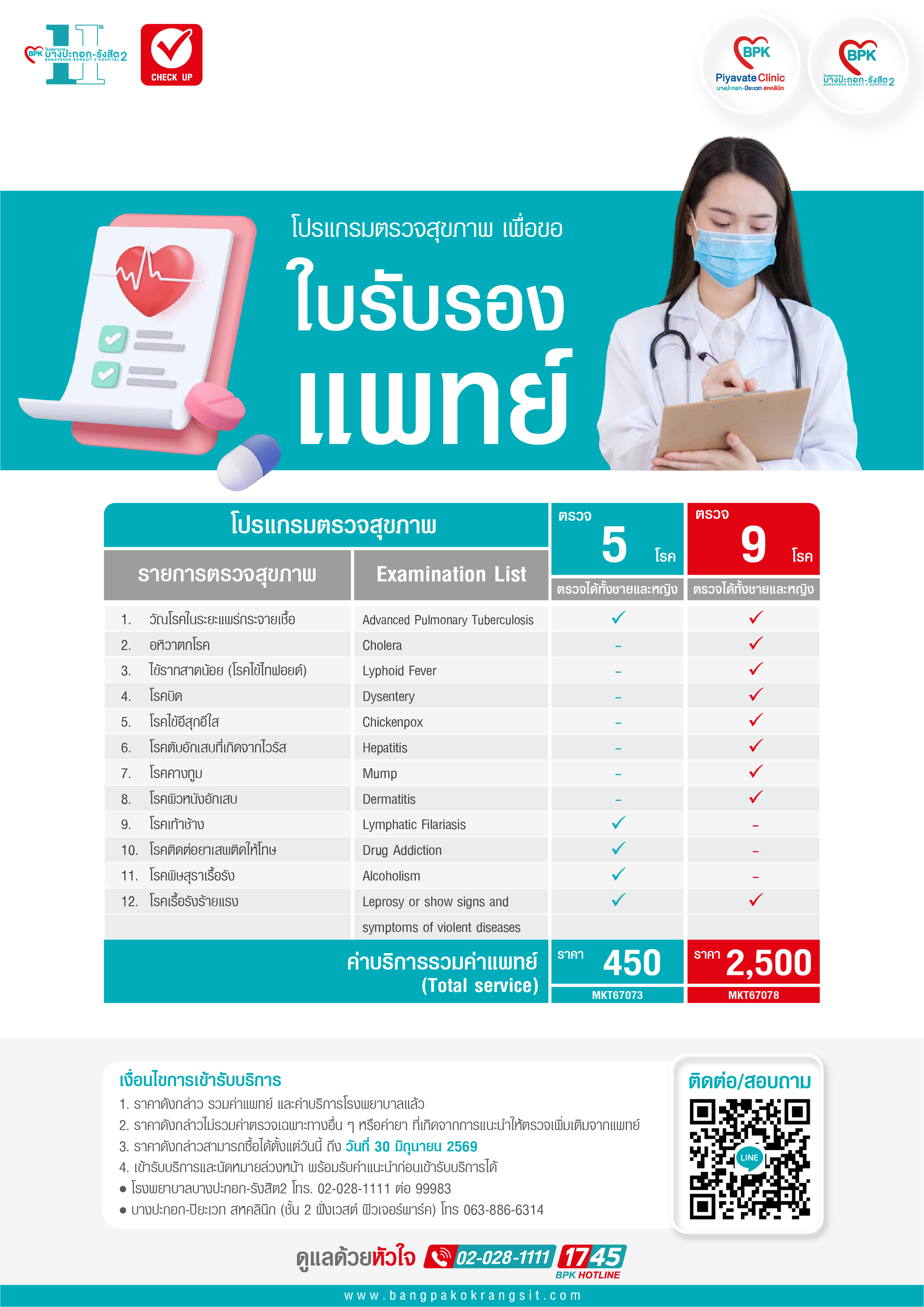 - ราคาพิเศษดังกล่าวไม่รวมค่าตรวจเฉพาะทางอื่นๆ หรือค่ายาที่เกิดขึ้นนอกเหนือจากแพ็กเกจ