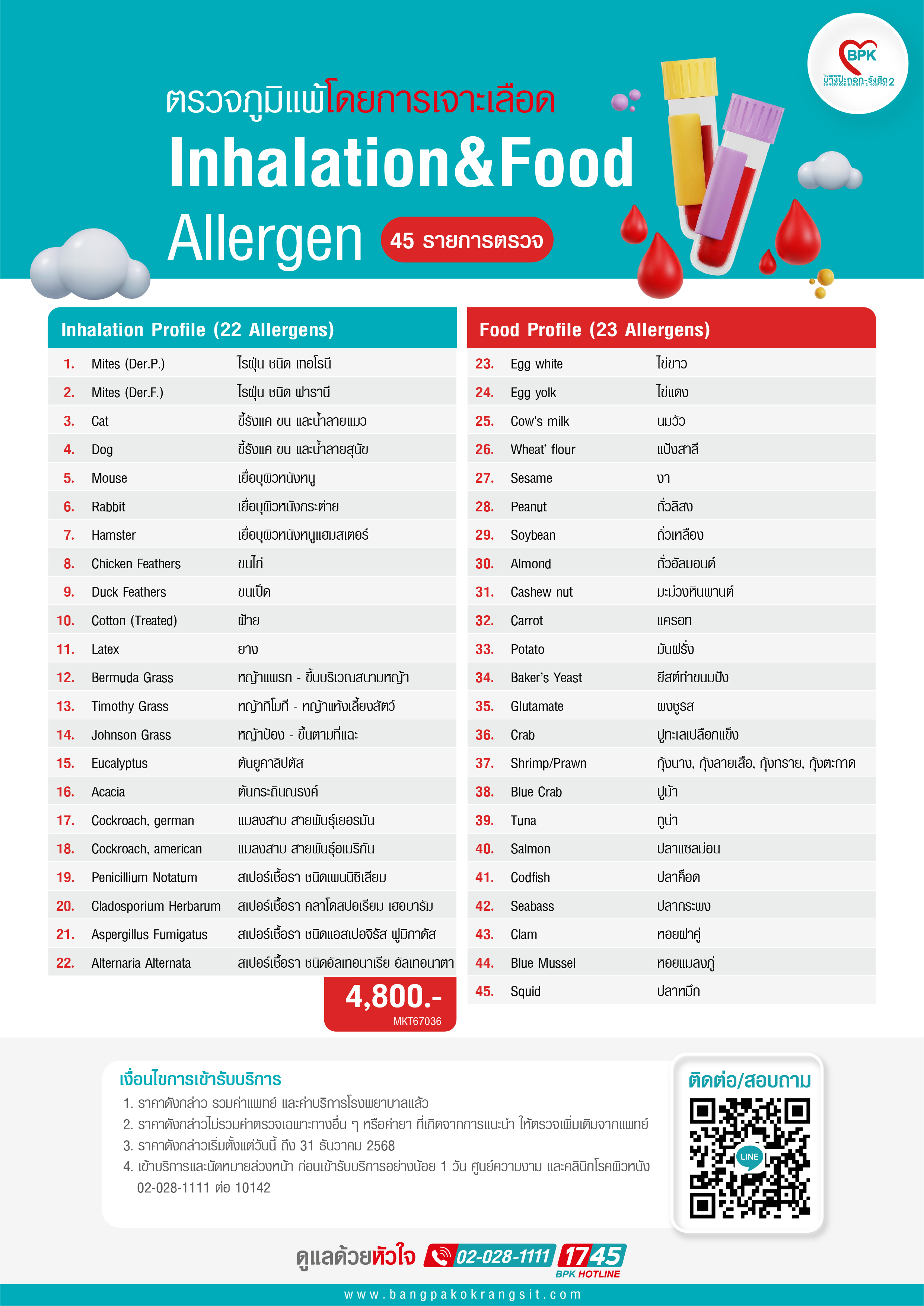 ตรวจภูมิแพ้ผิวหนังและแพ้อาหาร 45 รายการ ด้วยวิธีเจาะเลือด (Inhalation & Food Allergen) ที่ โรงพยาบาลบางปะกอก-รังสิต2