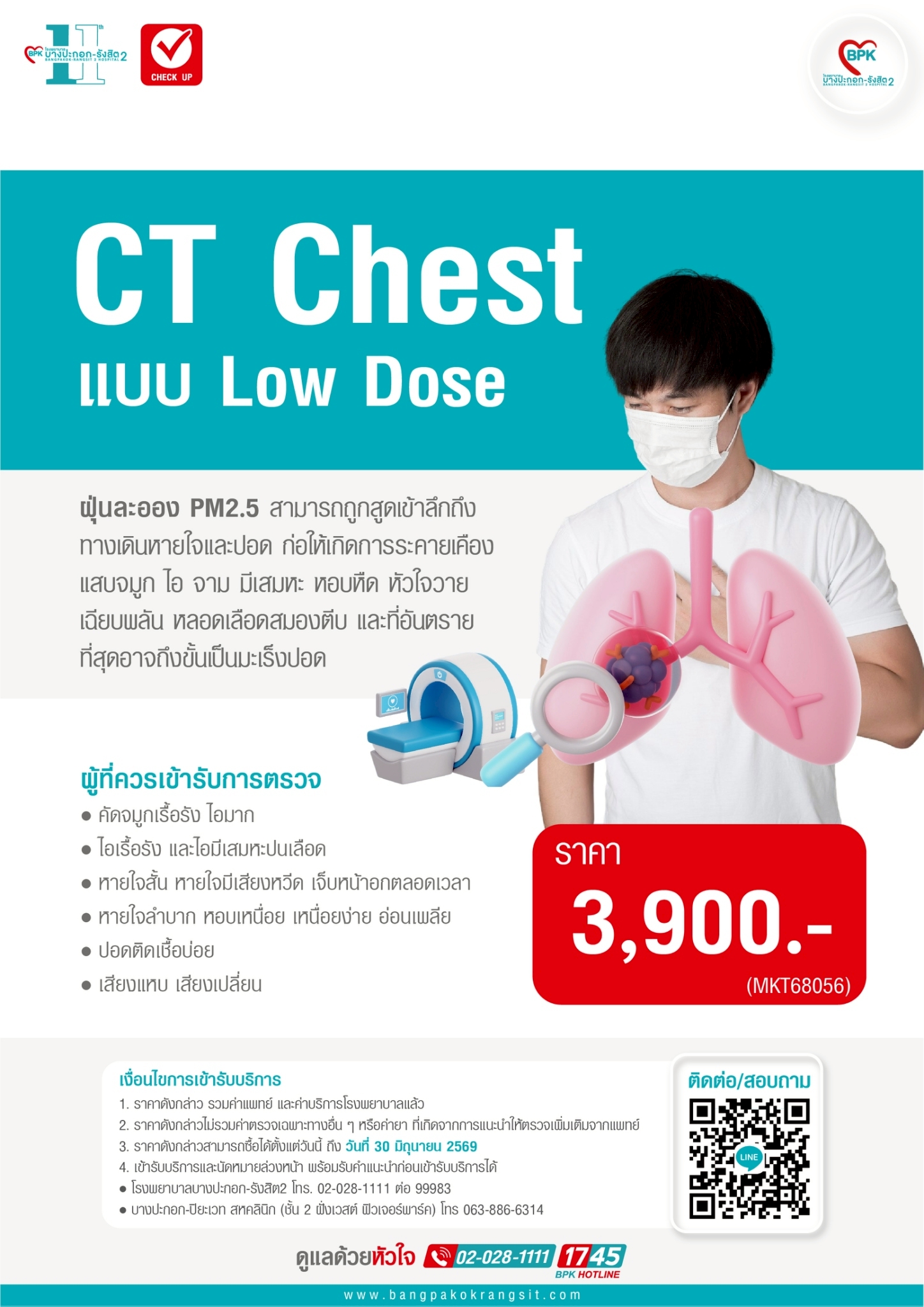 - ราคาพิเศษดังกล่าวไม่รวมค่าตรวจเฉพาะทางอื่นๆ หรือค่ายาที่เกิดขึ้นนอกเหนือจากแพ็กเกจ