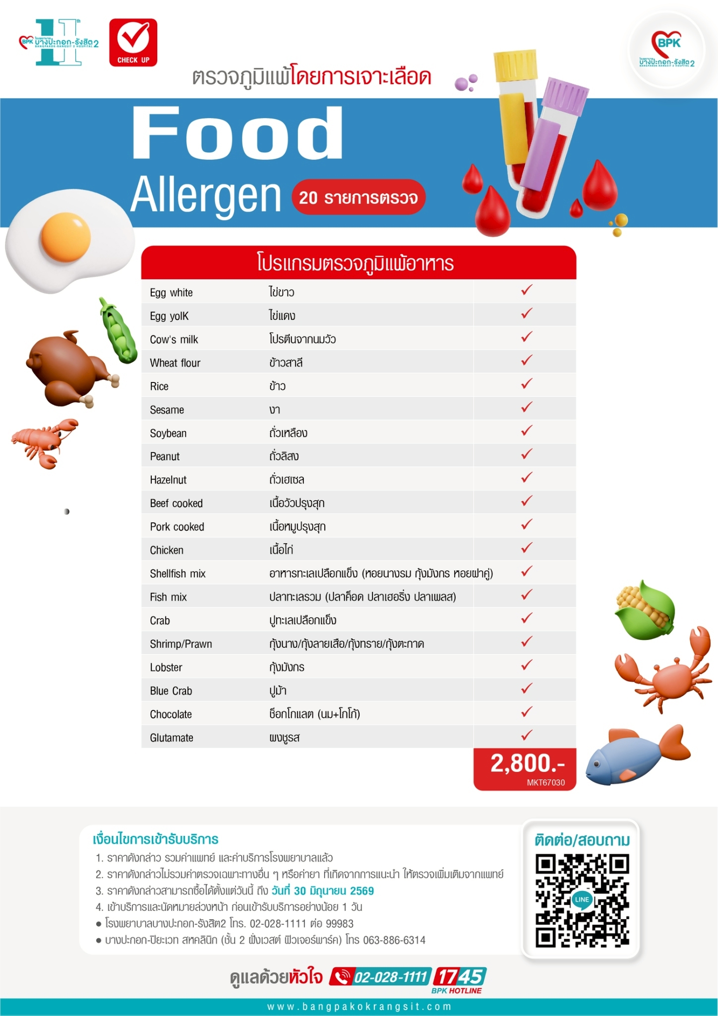 ตรวจภูมิแพ้ผิวหนังและแพ้อาหาร 20 รายการ ด้วยวิธีเจาะเลือด (Food Allergen) ที่ โรงพยาบาลบางปะกอก-รังสิต2